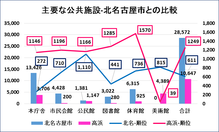 ●「公共施設」も「高浜-人口比- 2倍」に対し「施設-面積-3倍」は納税効果も絶大です